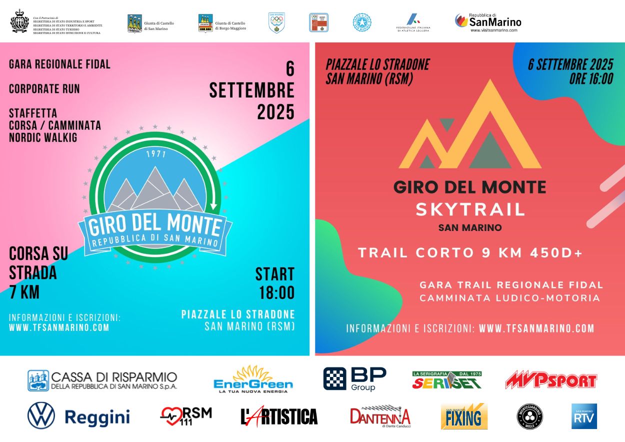 Lo Skytrail Giro del Monte partirà alle ore 16 su un percorso di 9 km con dislivello di 450 metri, valido come gara regionale Fidal, ma affrontabile anche come camminata-ludico motoria, che passerà per boschi, sentieri e contrade del centro storico di San Marino e i più spettacolari punti panoramici con vista mare.