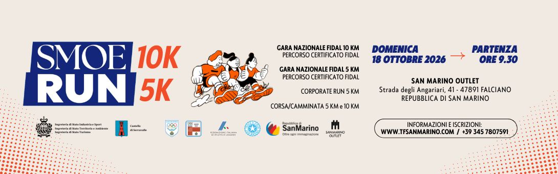 SMOE RUN San Marino 2026 è podistica competitiva FIDAL 10 km e 5 Km, Corporate Run (5 km) e non competitiva (5 km), con partenza alle ore 9:30, al San Marino Outlet, in Strada degli Angariari, 41 – 47891 Falciano (Repubblica di San Marino). Disponibile il percorso su Garmin Connect e Strava.